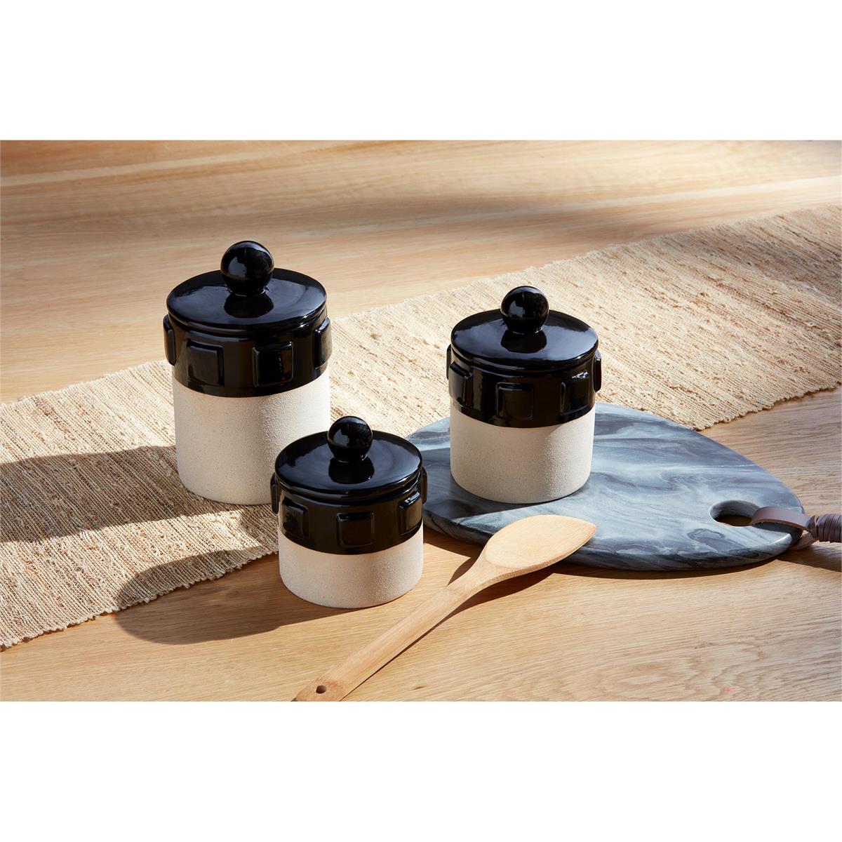 Increase your kitchen storage with our Black Two-Tone Bead Canister Set. Crafted with glazed and exposed stoneware, this set includes three canisters with bead finial lids. Keep your goods fresh in style while adding a touch of elegance to your countertop.