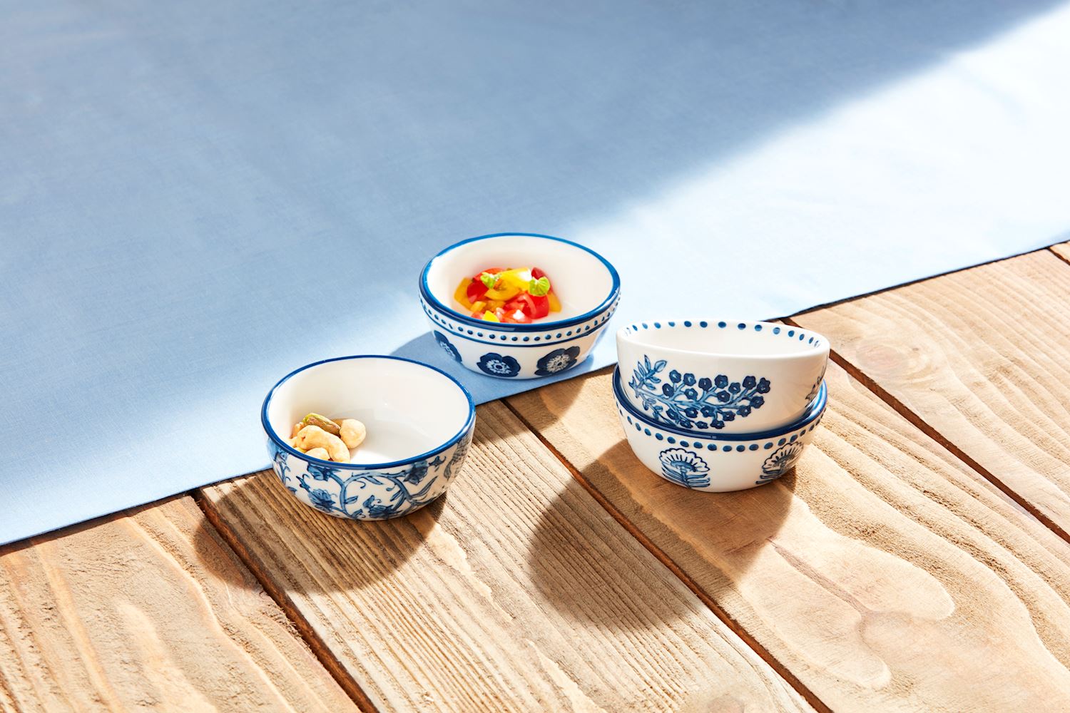 This set of two hand-stamped bowls features a unique and eye-catching hand-painted rim. Perfect for serving small bites or accompaniments.