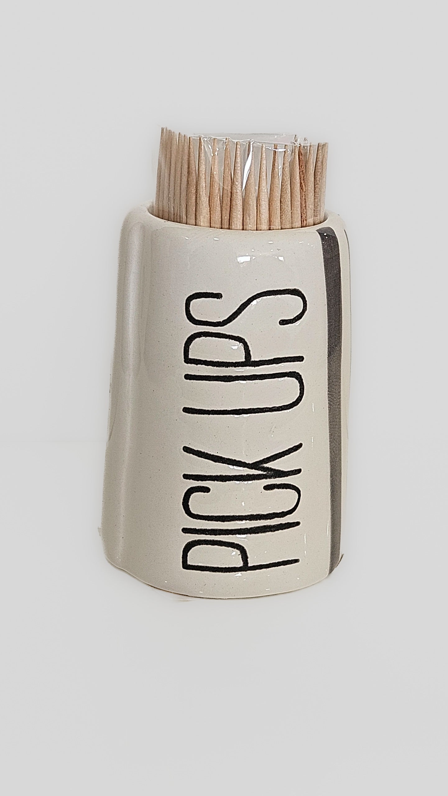 The "Pick Ups" Toothpick Holder is a stylish and functional addition to any dining set. Made of wrapped ceramic. Keep your toothpicks organized and easily accessible with this eye-catching holder.